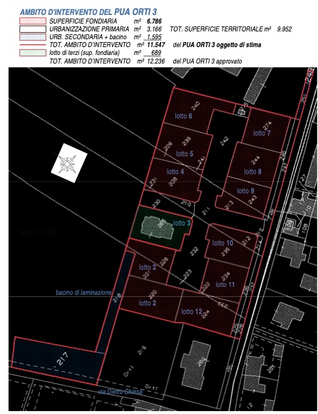 BONAVIGO (VR) - VIA DON ROMOLO TRESSINO - Piena proprietà di terreni oggetto di lottizzazione residenziale in corso di urbanizzazione (lottizzazione con opere interrotte e confini da ridefinire di 12 lotti con sup. totale ambito d’intervento di mq. 12.236 catastali di cui mq. 689 di sup. fondiaria in proprietà di terzi), in ambito d’intervento denominato PUA ORTI 3, di 11.547 mq. (di cui sup. fondiaria mq. 6.786, sup. strada, V, P mq. 3.166, sup. urb. secondaria mq. 1.595), costituito da: 11 lotti con volume edificabile di mc. 700 ciascuno per un totale di volume edificabile di mc. 9.727; le opere della urbanizzazione primaria del PUA, costituite dalla strada interna con i relativi marciapiedi e parcheggi stradali, da un tratto di pista ciclabile con l’area verde e dalla cabina elettrica ricavata nel PUA, con tutti i sottoservizi urbani (fognatura, rete acque bianche, rete telefonica, elettrica, idrica e gas, illuminazione pubblica), e le opere di urbanizzazione secondaria, costituite da un’area destinata a parcheggio pubblico, a ovest del PUA e in fregio a via Dietro Chiesa e da un tratto a est della pista ciclabile, a cui va aggiunta la zona destinata a vasca di laminazione non costituente superficie territoriale e non oggetto di cessione convenzionata come opera di urbanizzazione.
