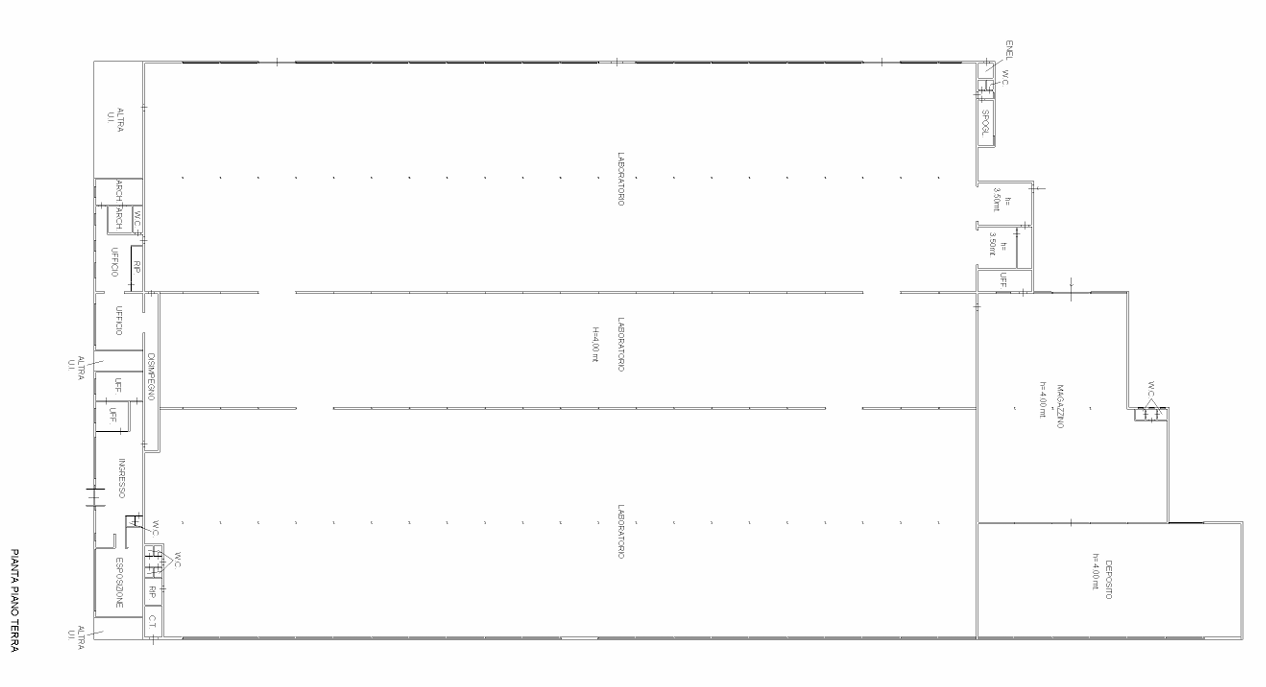 Il capannone, di 10.208 mq, si sviluppa interamente al piano terra ed è suddiviso in 3 laboratori della lunghezza di 110 ml, costruiti in aderenza e collegati tra loro. A nord degli stessi: zona ingresso, esposizione, uffici e zona servizi igienici, nonché a sud deposito, magazzino e vari altri servizi.